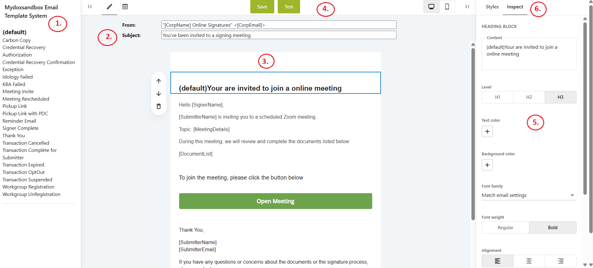 - There are Save and Test buttons at the top to capture changes and send yourself a copy to see how the final product will look.