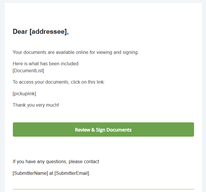 Text in the message can be changed, along with buttons included for various actions that you want the signer or submitter to perform when they get the message.