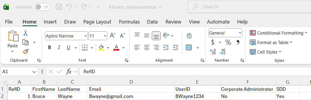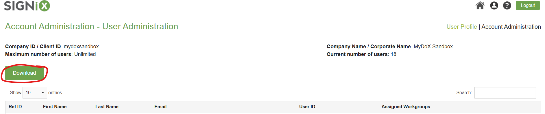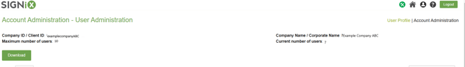 Click on the "Download" button found at the top left side of the User Administration screen, and then your browser should display a downloaded CSV file.