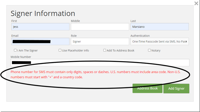 When adding a signer to a new transaction with OTP authentication, the phone number must be entered a certain way or an error will appear.