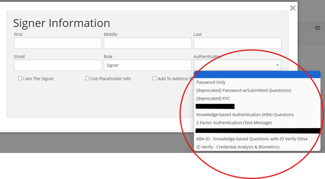 We call these options authentication methods, and you must always choose one method for each of your signers on a transaction. By default, the drop-down menu will appear blank at first, so that the submitter can make a choice as to which option they require for the transaction being created.